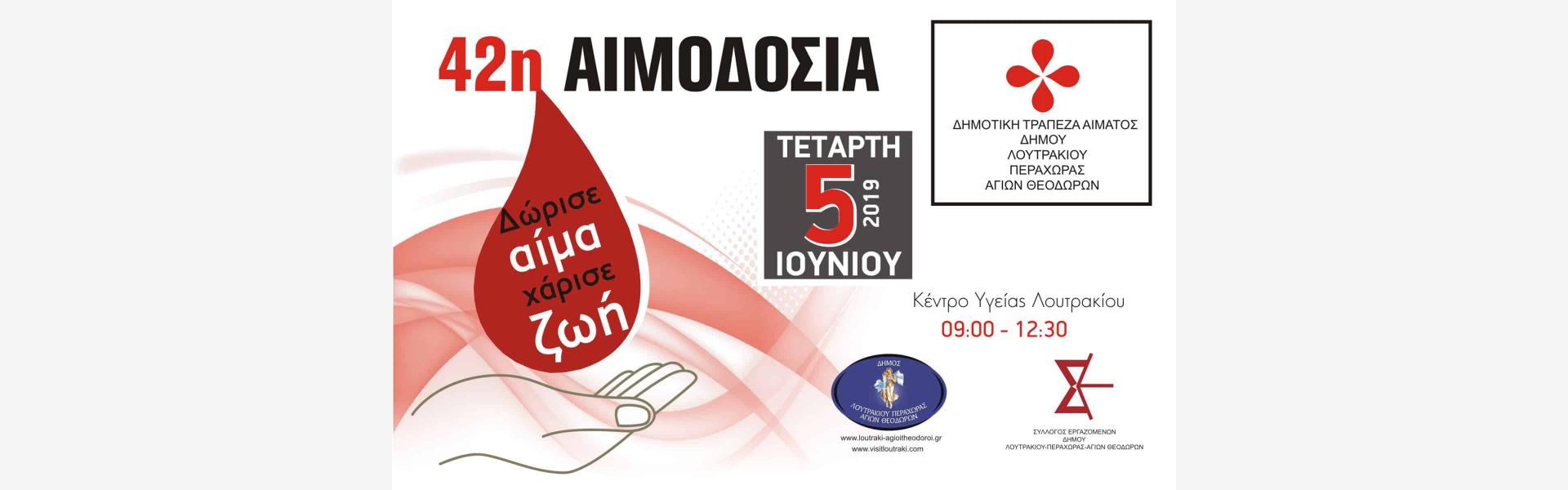 Ο Δήμος Λουτρακίου – Περαχώρας – Αγίων Θεοδώρων σε συνεργασία με το Σύλλογο Εργαζομένων του Δήμου, θα πραγματοποιήσουν εθελοντική αιμοδοσία την Τετάρτη 5 Ιουνίου 2019, στο Κέντρο Υγείας Λουτρακίου, από τις 09.00π.μ. μέχρι τις 12.30μ.μ.