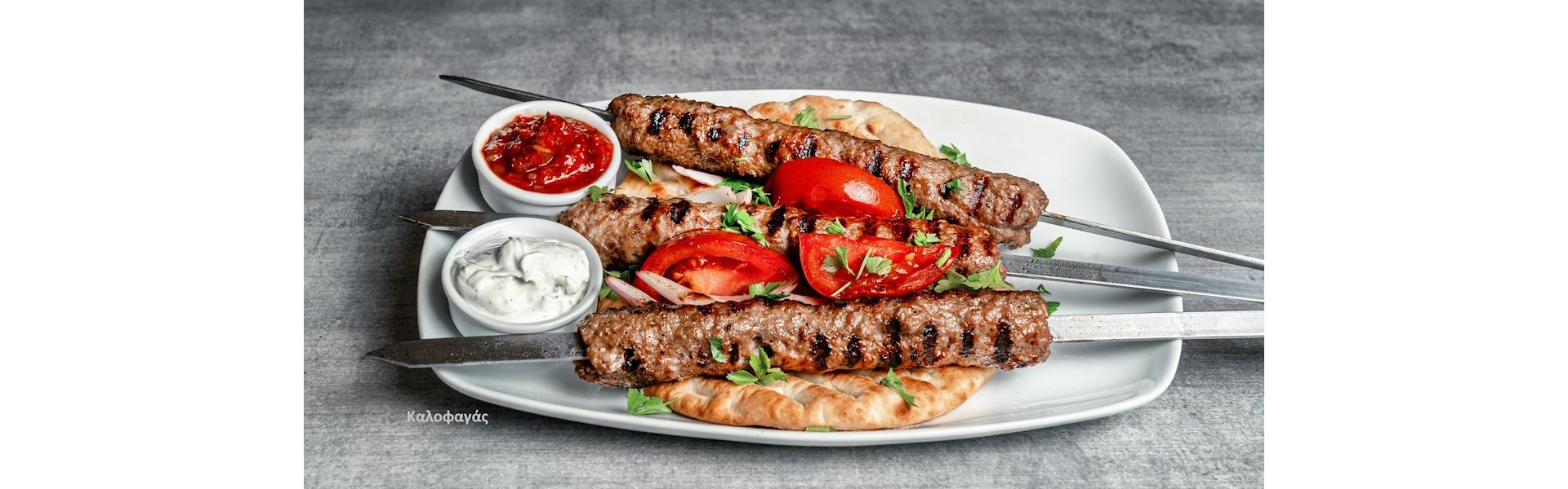Ο Καλοφαγάς προσφέρει ελληνική πίτα με χοιρινό άριστης ποιότητας, πίτα κοτόπουλου, χοιρινό και κοτόπουλο σε sticks και κεμπάπ συνοδευόμενο από ορεκτικά και ζεστά πιάτα.
