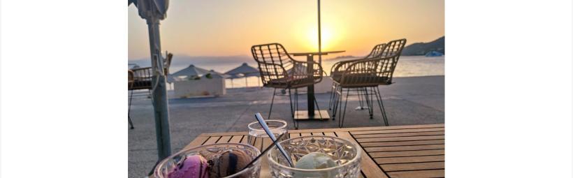 Καφές, θάλασσα, ηλιοβασίλεμα, παγωτό, χαλάρωση, θέα, γεύση, εμπειρία, απόλαυση, φιλοξενία.