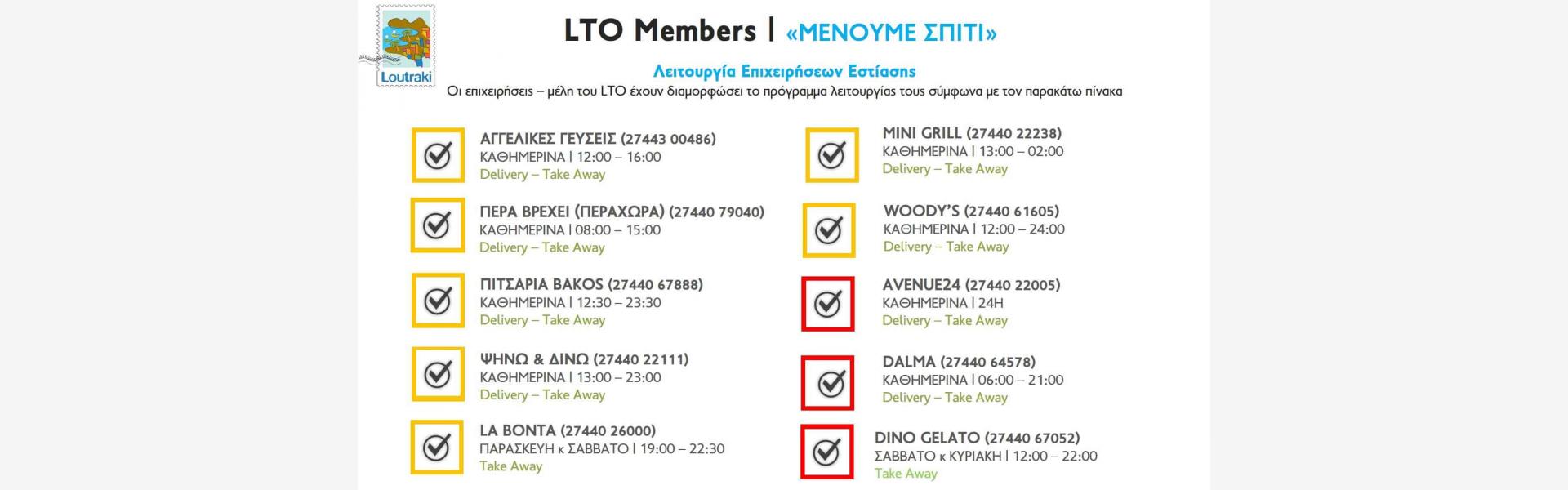 Στο πλαίσιο της λήψης έκτακτων μέτρων που αφορούν τις τουριστικές επιχειρήσεις λόγω του κορωνοϊού Covid-19, οι επιχειρήσεις εστίασης – μέλη του LTO έχουν διαμορφώσει το πρόγραμμα λειτουργίας τους σύμφωνα με τον παρακάτω πίνακα.