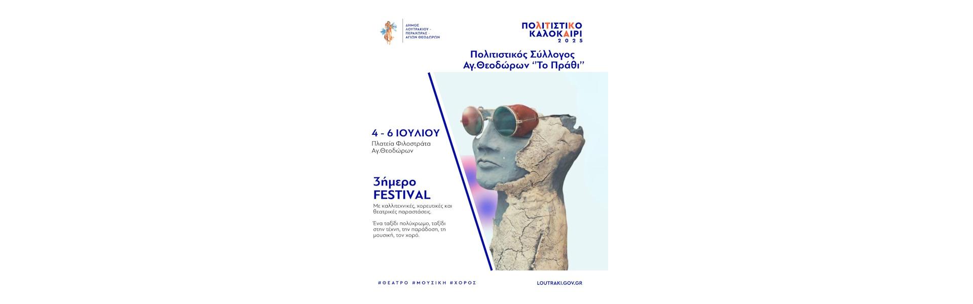 Έρχεται το καλοκαιρινό FESTIVAL του Πολιτιστικού Συλλόγου Αγίων Θεοδώρων "Το Πράθι", την Παρασκευή 4 Ιουλίου, το Σάββατο 5 Ιουλίου και την Κυριακή 6 Ιουλίου με καλλιτεχνικές, χορευτικές και θεατρικές παραστάσεις.