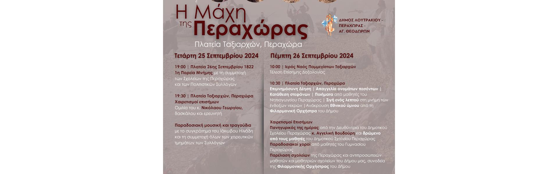 10:30 | Πλατεία Ταξιαρχών, Περαχώρα | Επιμνημόσυνη Δέηση | Απαγγελία ονομάτων πεσόντων | Κατάθεση στεφάνων | Ποιήματα από μαθητές του Νηπιαγωγείου Περαχώρας | Σιγή ενός λεπτού στη μνήμη των ένδοξων νεκρώνβ| Ανάκρουση Εθνικού ύμνου από τη Φιλαρμονική Ορχήστρα του Δήμου Λουτρακίου - Περαχώρας - Αγ. Θεοδώρων