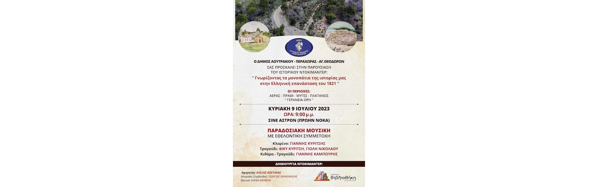 Ο Δήμος Λουτρακίου – Περαχώρας – Αγίων Θεοδώρων σας προσκαλεί στην παρουσίαση του ιστορικού ντοκιμαντέρ «Γνωρίζοντας τα μονοπάτια της ιστορίας μας στην Ελληνική Επανάσταση 1821»