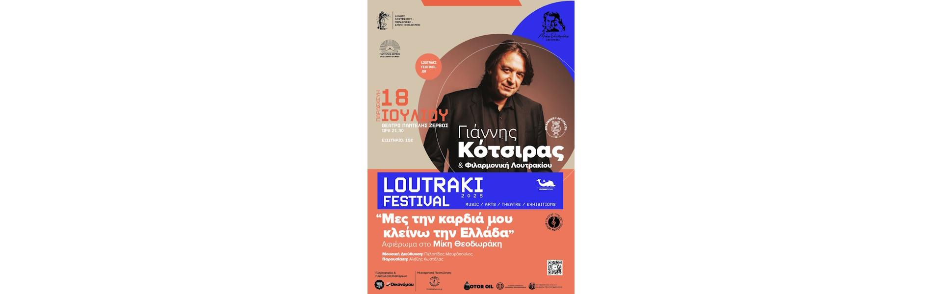 Η Φιλαρμονική Ορχήστρα Λουτρακίου παρουσιάζει μια μεγαλειώδη συναυλία-αφιέρωμα στον Μίκη Θεοδωράκη, με τίτλο «Μες την καρδιά μου κλείνω την Ελλάδα», την Παρασκευή 18 Ιουλίου στο Θέατρο Παντελής Ζερβός, με τη συμμετοχή του σπουδαίου ερμηνευτή Γιάννη Κότσιρα.