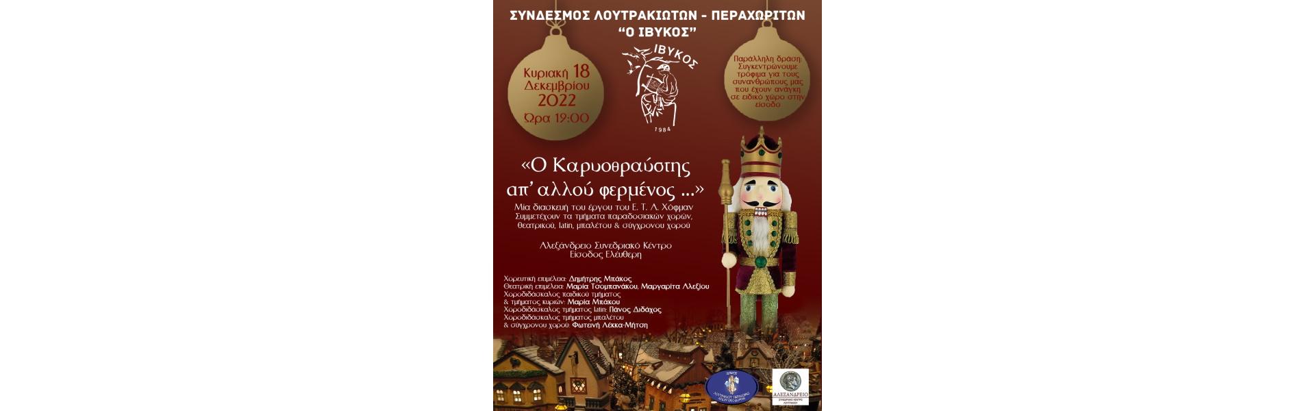 | Τετάρτη 28 Δεκεμβρίου 2022 | ώρα 17:30 – 20:00 | Πλατεία 25ης Μαρτίου, Λουτράκι