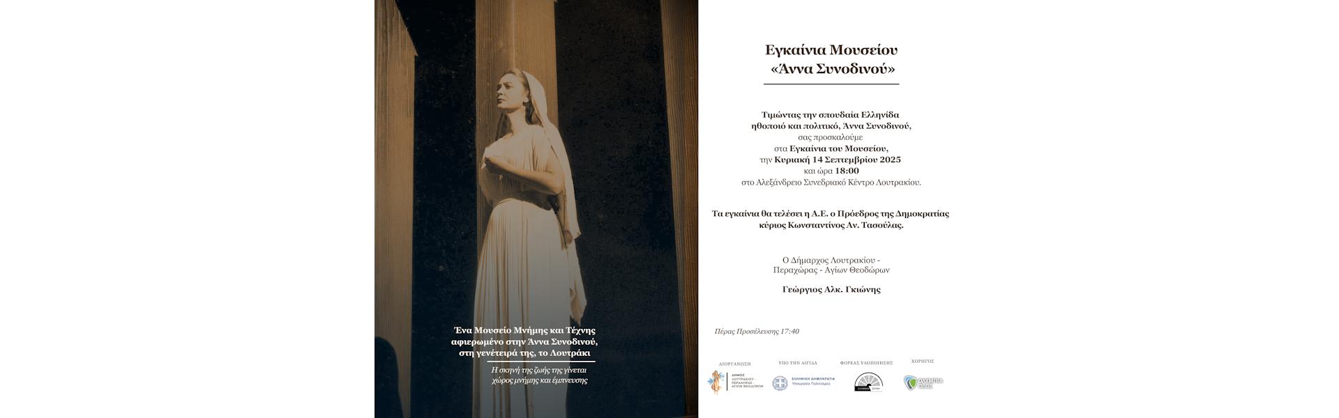 Τιμώντας την σπουδαία Ελληνίδα ηθοποιό και πολιτικό, Άννα Συνοδινού, σας προσκαλούμε στα Εγκαίνια του Μουσείου, την Κυριακή 14 Σεπτεμβρίου 2025 και ώρα 18:00 στο Αλεξάνδρειο Συνεδριακό Κέντρο Λουτρακίου.