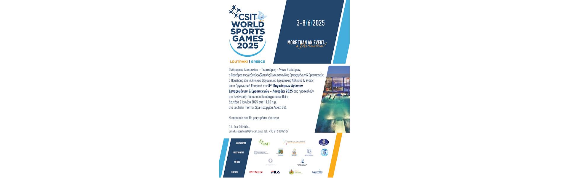 Σας προσκαλούμε να παρευρεθείτε στη Συνέντευξη Τύπου για τους 8ους Παγκόσμιους Αγώνες Εργαζομένων & Ερασιτεχνών – Λουτράκι 2025,