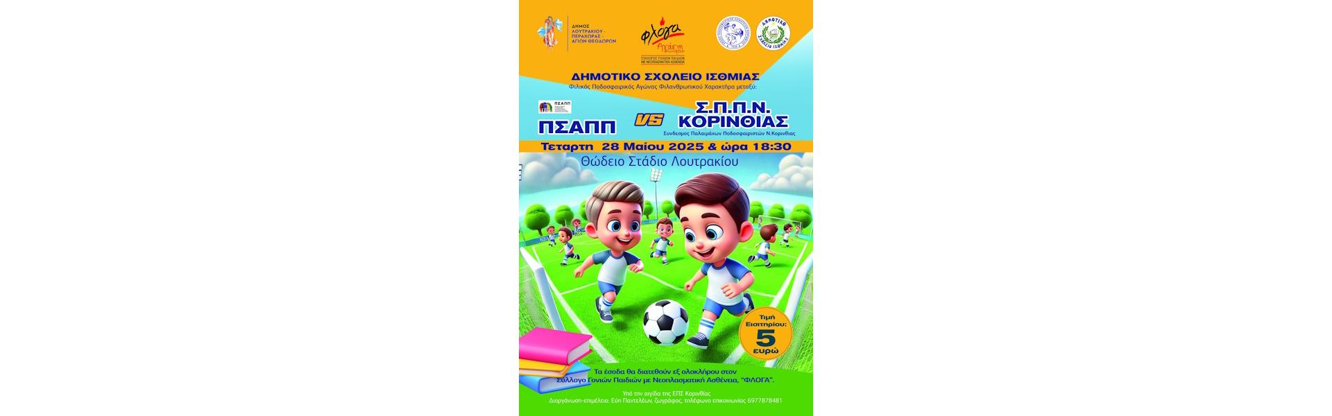 Το Δημοτικό Σχολείο Ισθμίας διοργανώνει έναν ξεχωριστό φιλικό ποδοσφαιρικό αγώνα φιλανθρωπικού χαρακτήρα την Τετάρτη 28 Μαΐου 2025, στις 18:30, στο Θώδειο Δημοτικό Στάδιο Λουτρακίου.