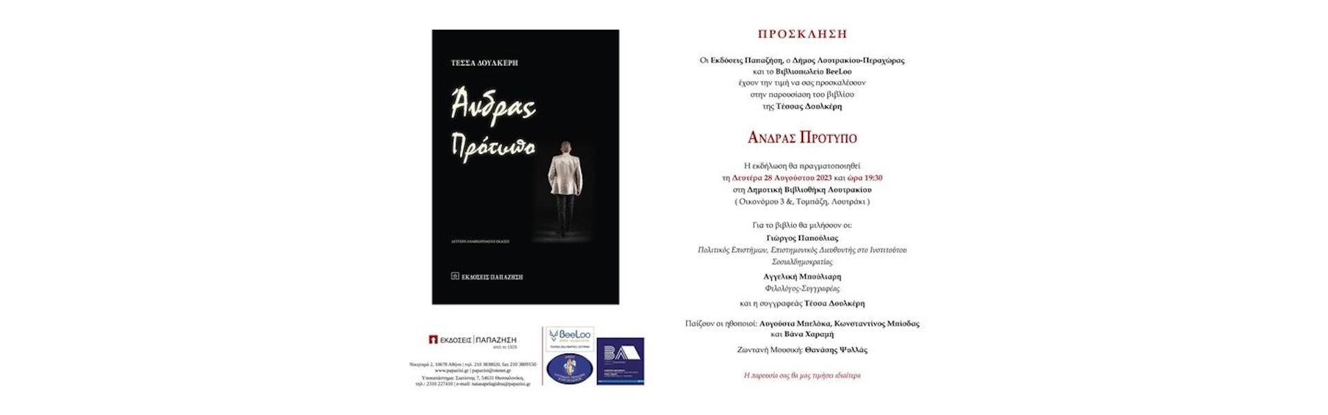 Οι Εκδόσεις Παπαζήση, ο Δήμος Λουτρακίου - Περαχώρας - Αγίων Θεοδώρων και το βιβλιοπωλείο Beeloo έχουν την τιμή να σας προσκαλέσουν