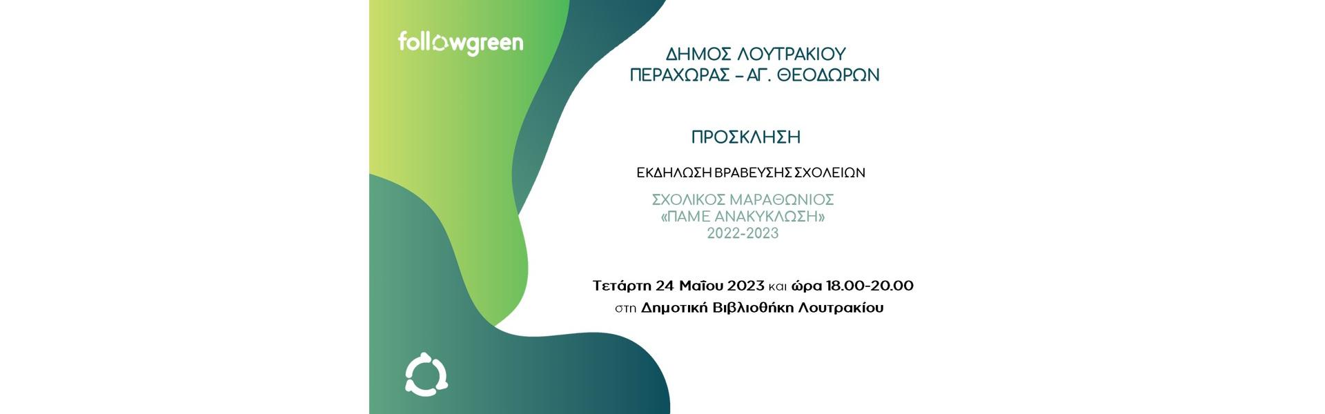 Η εκδήλωση βράβευσης των σχολείων λαμβάνει χώρα στο πλαίσιο του 5ου Σχολικού Μαραθωνίου Ανακύκλωσης «Πάμε ανακύκλωση 2022 -2023», της δημοτικής πλατφόρμας ανακύκλωσης Followgreen του Δήμου Λουτρακίου – Περαχώρας – Αγ. Θεοδώρων.