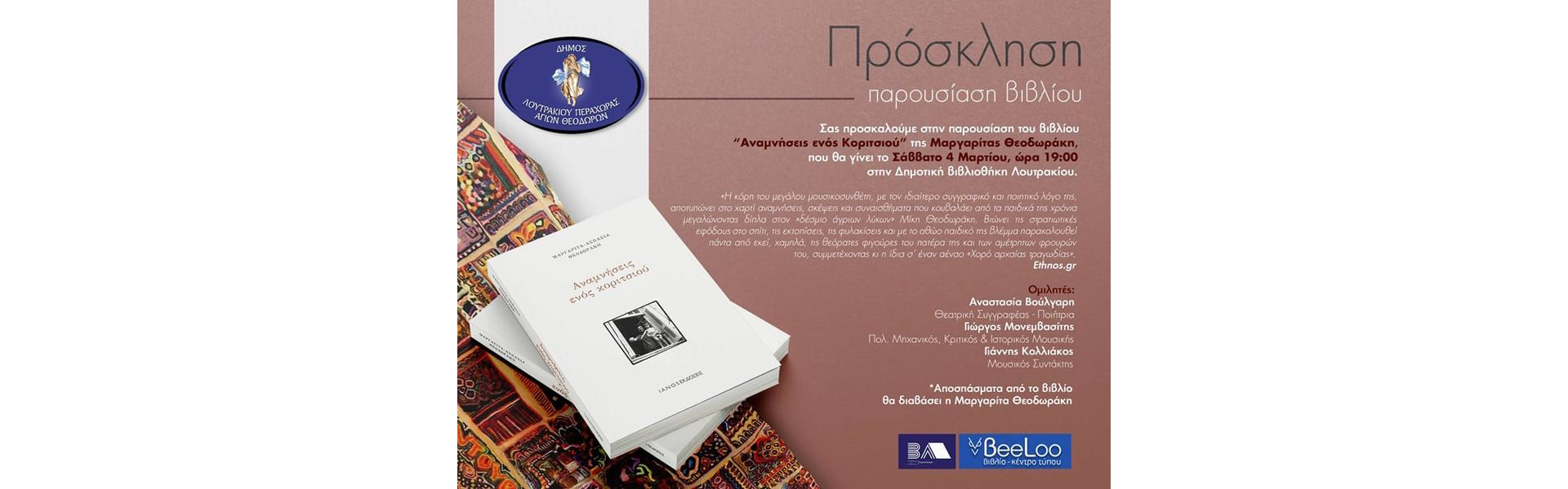 Το Σάββατο 4 Μαρτίου 2023 στις 7 το απόγευμα στη Δημοτική Βιβλιοθήκη Λουτρακίου.
