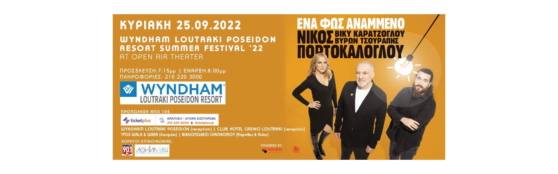 Το ανοιχτό θέατρο του ξενοδοχείου Wyndham Loutraki Poseidon Resort υποδέχεται τον Νίκο Πορτοκάλογλου μαζί με τη Βίκυ Καρατζόγλου και τον Βύρωνα Τσουράπη στην τελευταία παράσταση του φετινού καλοκαιριού “Ένα Φως Αναμμένο” την Κυριακή 25 Σεπτεμβρίου στις 20:00.