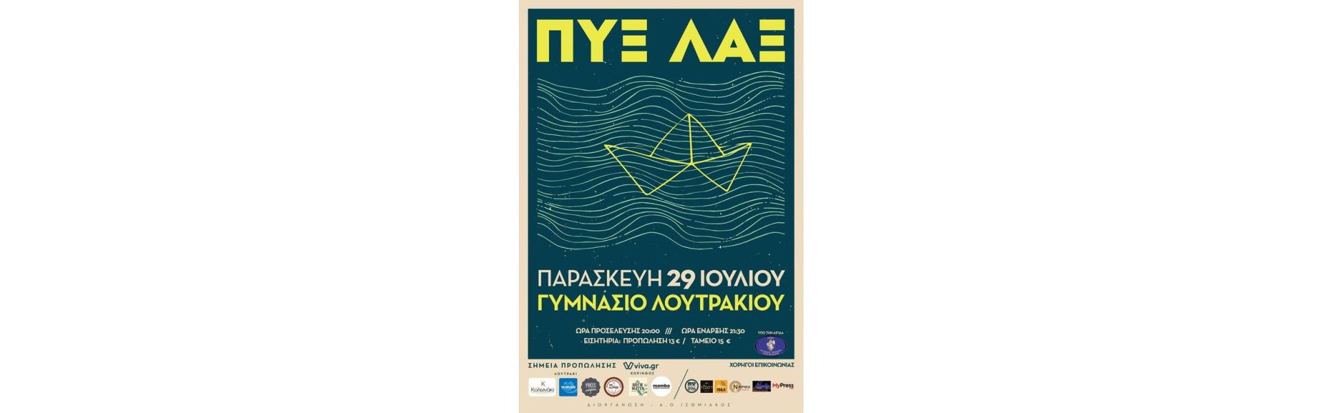 Οι ΠΥΞ-ΛΑΞ θα δώσουν καλοκαιρινή συναυλία στο Λουτράκι την Παρασκευή 29 Ιουλίου στο Γυμνάσιο Λουτρακίου . Ώρα έναρξης: 21.30. Διοργάνωση Α.Ο. Ισθμιακος. Υπό την αιγίδα του Δήμου Λουτρακίου – Περαχώρας – Αγίων Θεοδώρων.