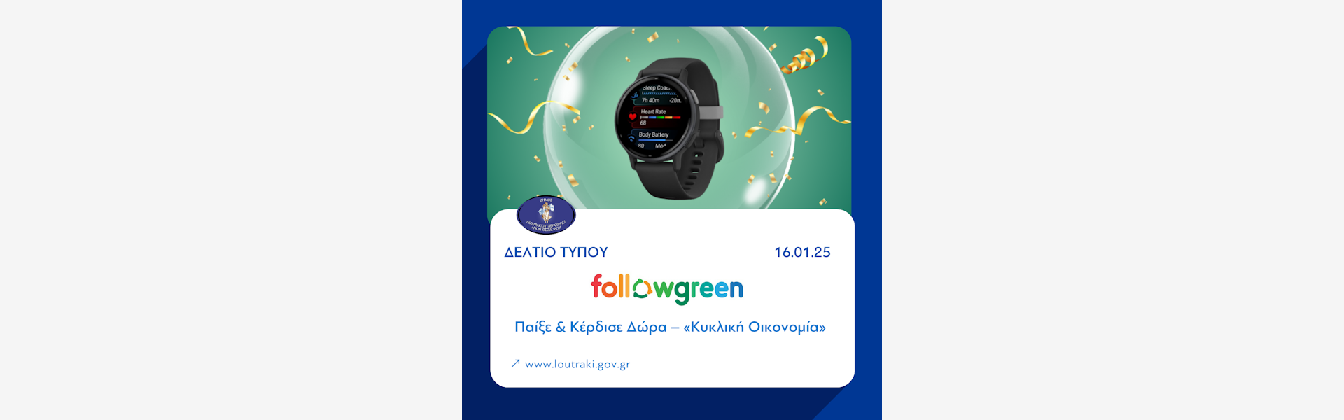 Το Followgreen του Δήμου Λουτρακίου - Περαχώρας - Αγ. Θεοδώρων σε καλεί να ανακαλύψεις την Κυκλική Οικονομία μέσα από μια μοναδική εμπειρία παιχνιδιού και γνώσης! Εξερεύνησε τον κόσμο της ανακύκλωσης και της βιωσιμότητας και γίνε κι εσύ πρωταγωνιστής της αλλαγής!