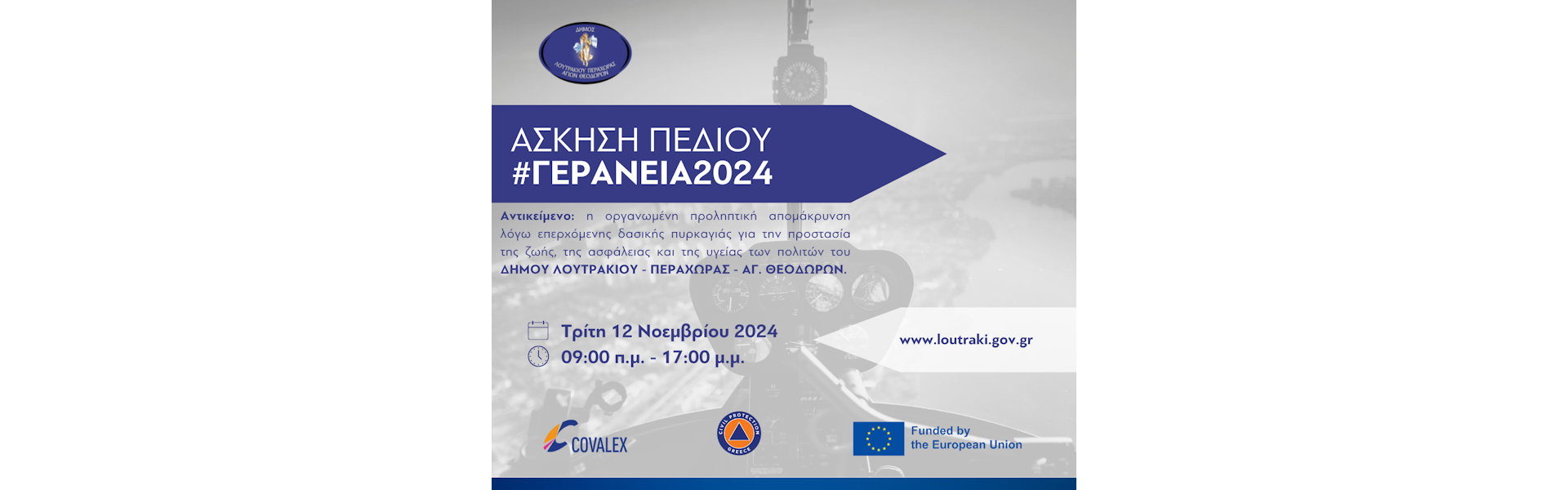 Το Υπουργείο Κλιματικής Κρίσης και Πολιτικής Προστασίας και ο Δήμος Λουτρακίου – Περαχώρας – Αγίων Θεοδώρων ανακοινώνουν τη διοργάνωση Επιχειρησιακής Άσκησης Πεδίου οργανωμένης προληπτικής απομάκρυνσης πολιτών εξαιτίας δασικής πυρκαγιάς «ΓΕΡΑΝΕΙΑ 2024», η οποία θα πραγματοποιηθεί την Τρίτη 12 Νοεμβρίου 2024, στο Λουτράκι, στο πλαίσιο του Ευρωπαϊκού Προγράμματος με την κωδική ονομασία COVALEX.