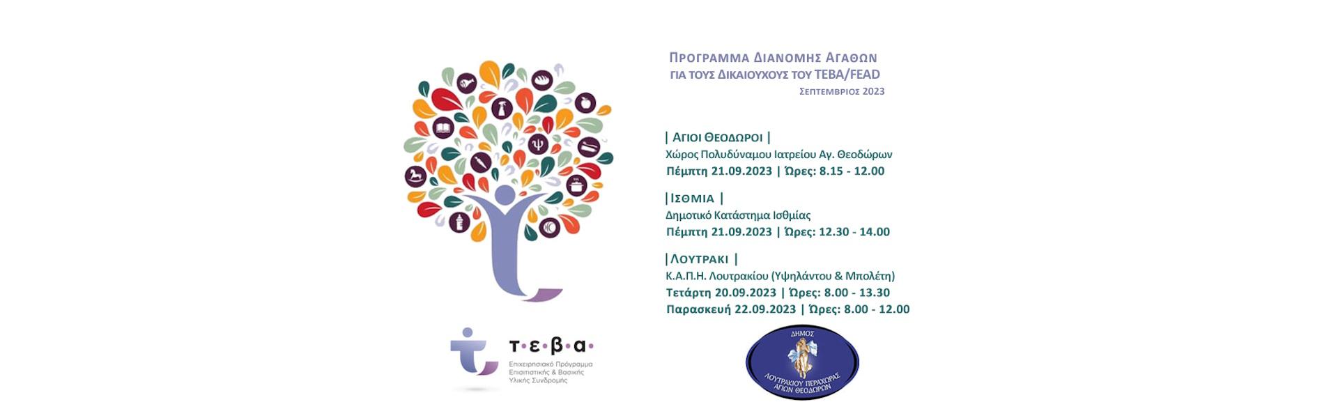 Ο Δήμος Λουτρακίου-Περαχώρας-Αγίων Θεοδώρων ως Εταίρος της Κοινωνικής Σύμπραξης Π.Ε. Κορινθίας υλοποιώντας δράσεις του Επιχειρησιακού Προγράμματος Επισιτιστικής και Βασικής Υλικής Συνδρομής, το οποίο χρηματοδοτείται από το Ταμείο Ευρωπαϊκής Βοήθειας για τους απόρους (ΤΕΒΑ/Fead) στα πλαίσια των Αποκεντρωμένων προμηθειών, καλεί