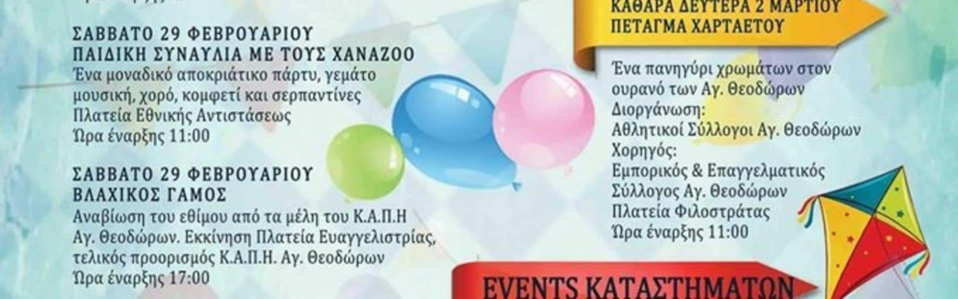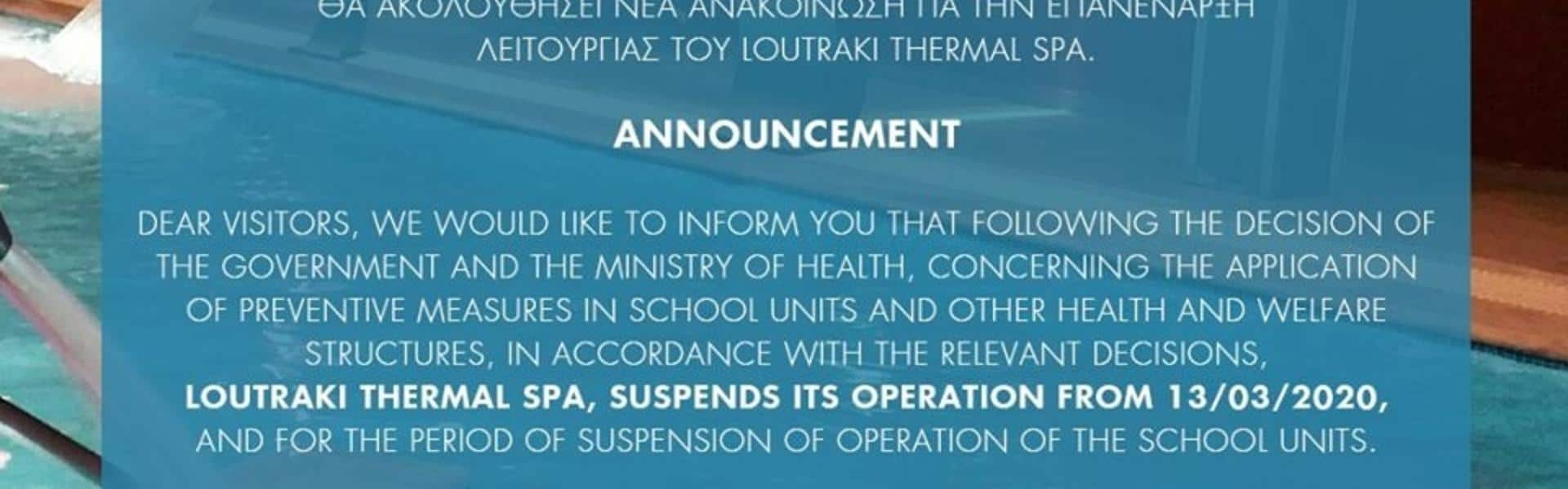 Σεβόμενοι την Απόφαση του Υπουργείου Υγείας για την ματαίωση όλων των Καρναβαλικών εκδηλώσεων σε όλη την Ελλάδα, ανακοινώνουμε την ακύρωση όλων των Καρναβαλικών εκδηλώσεων που έχουν προγραμματιστεί να πραγματοποιηθούν από τον Δήμο Λουτρακίου - Περαχώρας - Αγίων Θεοδώρων, έως και την Καθαρά Δευτέρα, λόγω του κορονοϊού.