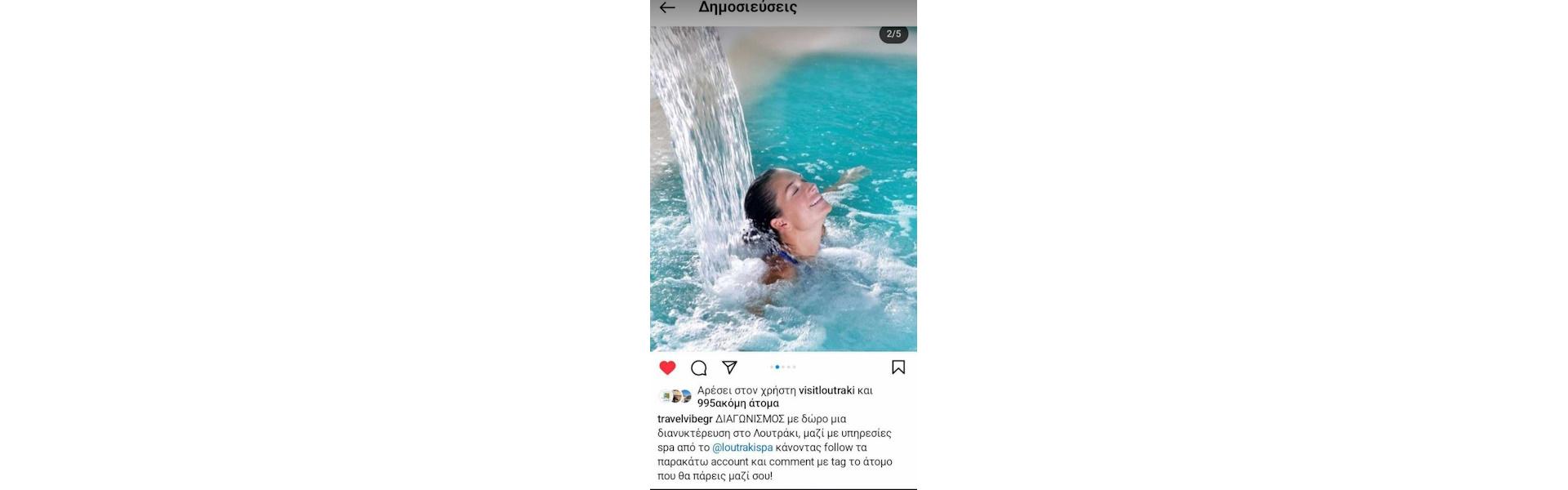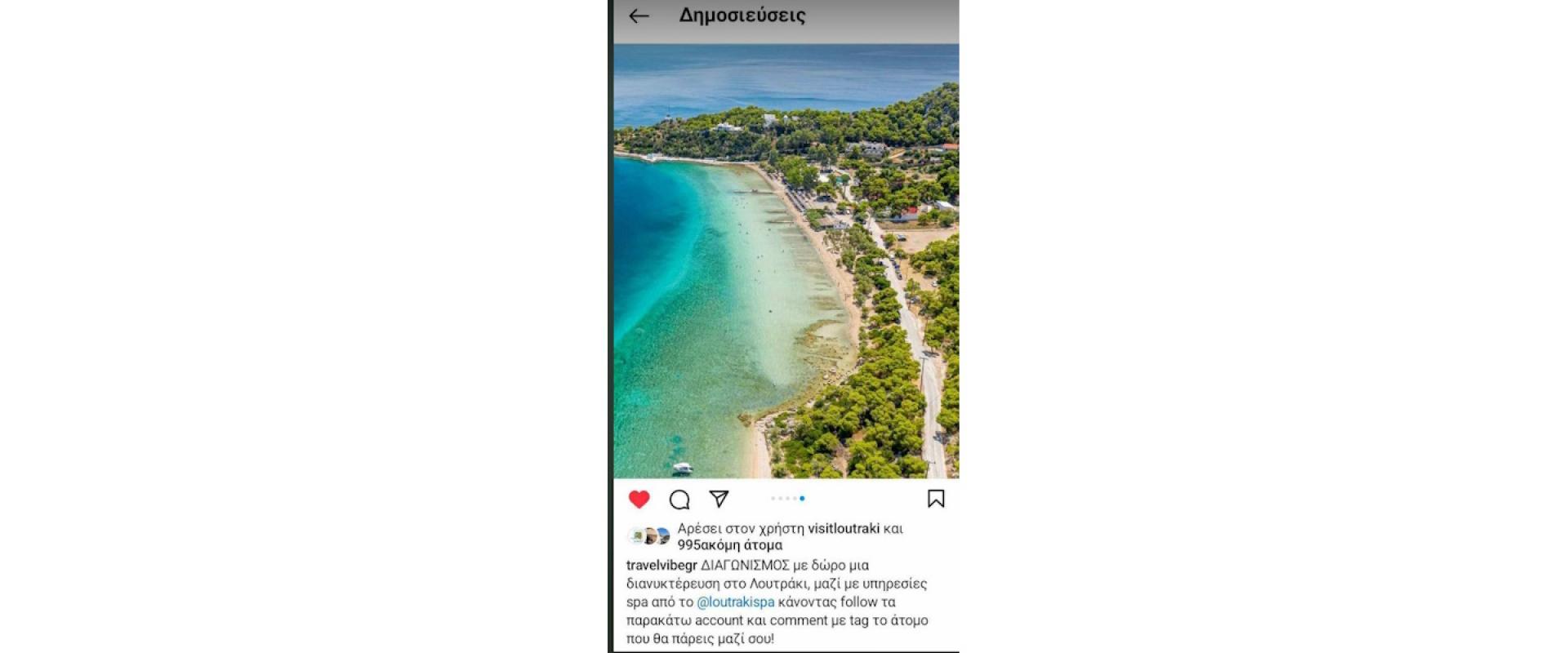 Η αγορά των Αθηνών συνεχίζει να είναι ένας από τους βασικούς στόχους για προβολή του προορισμού μας καθώς τόσο η εγγύτητα όσο και η πληθυσμιακή δυναμική της, αποτελούν ανεξάντλητη δεξαμενή επισκεπτών, που τονώνουν την επισκεψιμότητα. Ως βάση για τα κανάλια των διαφημίσεων χρησιμοποιούνται τα επίσημα κανάλια επικοινωνίας του Τουριστικού Οργανισμού Λουτρακίου (Visit Loutraki) σε Facebook & Instagram, με χιλιάδες views και likes.