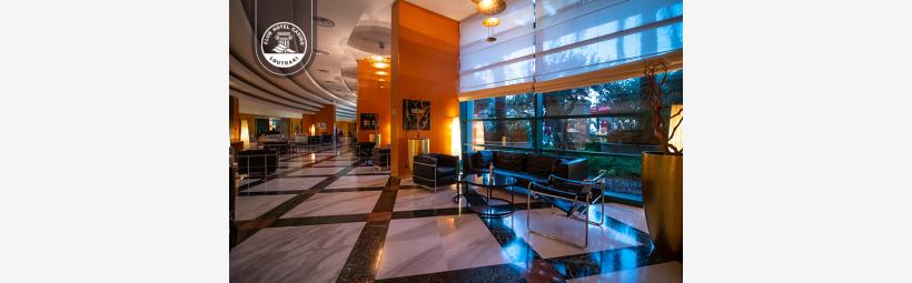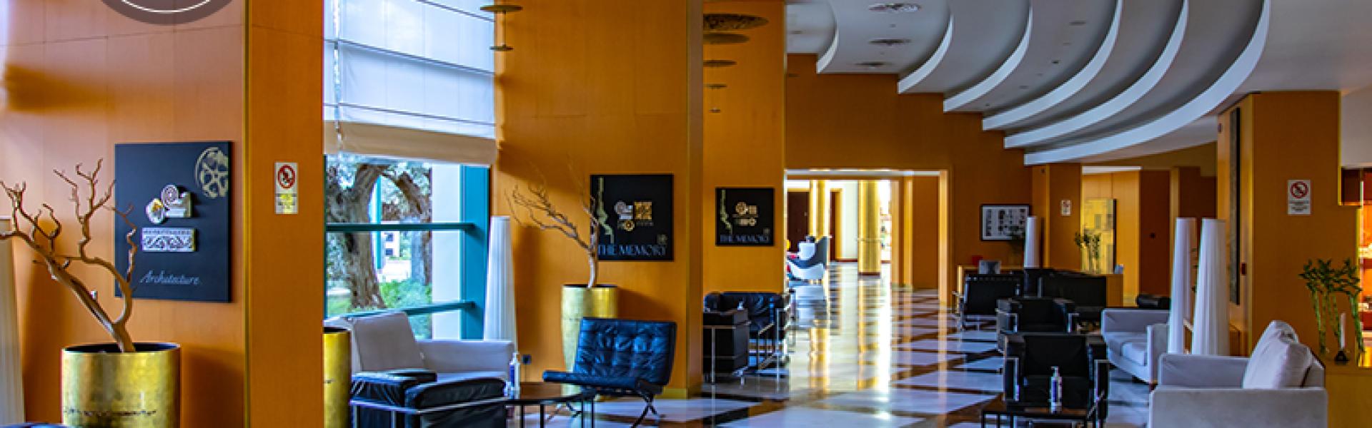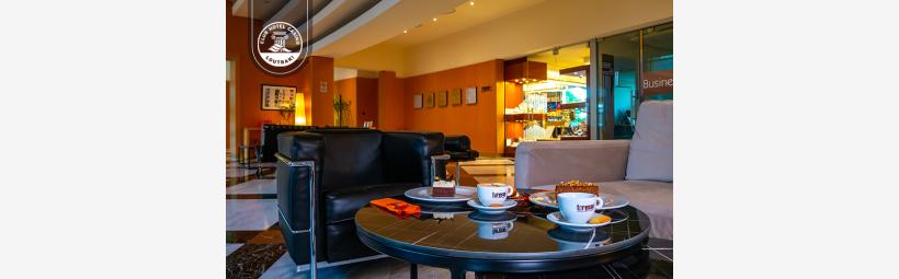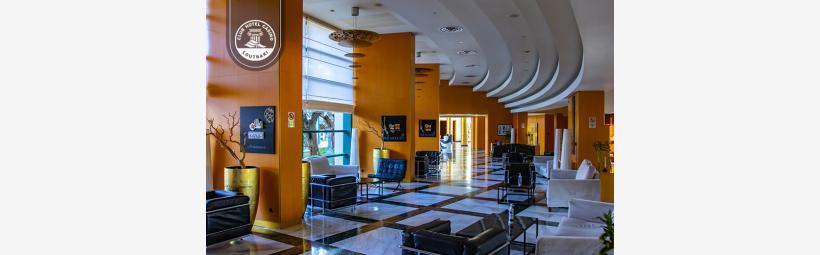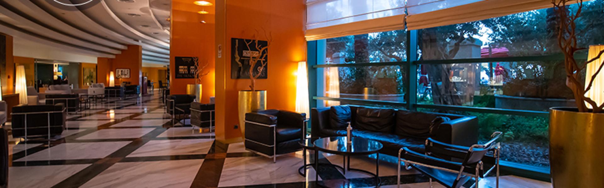 The Lobby Lounge of Club Hotel Loutraki is a premier meeting point, where modern aesthetics meet a relaxed atmosphere.