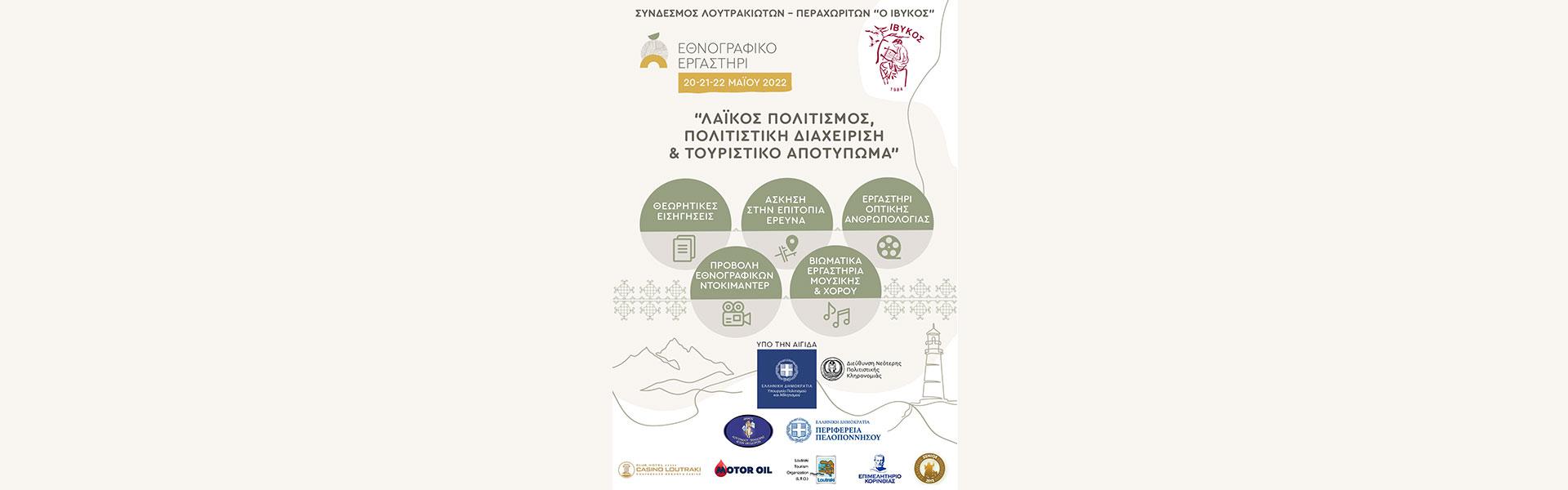 The IBYKOS Cultural Club of Loutraki - Perachorites under the auspices of the Directorate of Modern Cultural Heritage of the Ministry of Culture and Sports organizes on May 20, 21 and 22 the action "Ethnographic Laboratory: Popular Culture, Cultural Management and Tourist Footprint in the country" and Perachora of Corinth.