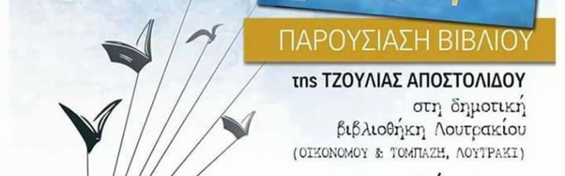 Saturday, 9 June, 2018 - 20:30Book presentation of Julia Apostolidou at the Municipal Library of LoutrakiExtracts of the book will be read by Sifis Polyzoidis and Margarita Alexiou. paroysiasi_vivlioy.jpg Cultural