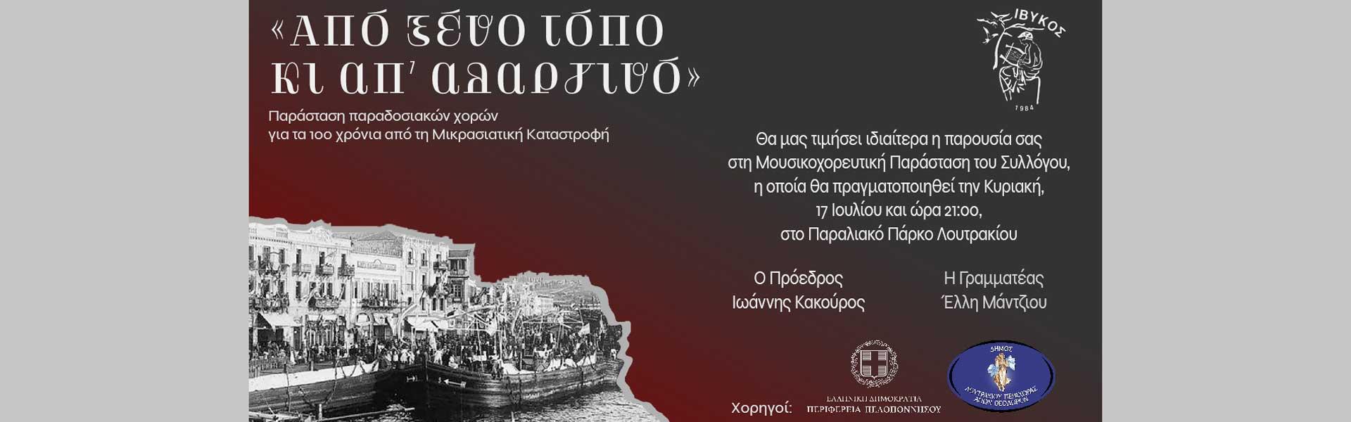 On behalf of the Board of Directors of the "Association of Loutraki - Perachori - O Ivykos", we invite you with great pleasure to the thematic music and dance performance of traditional dances of all sections of our association, on Sunday, July 17, 2022 at 9:00 p.m., at the Beach Park of Loutraki.