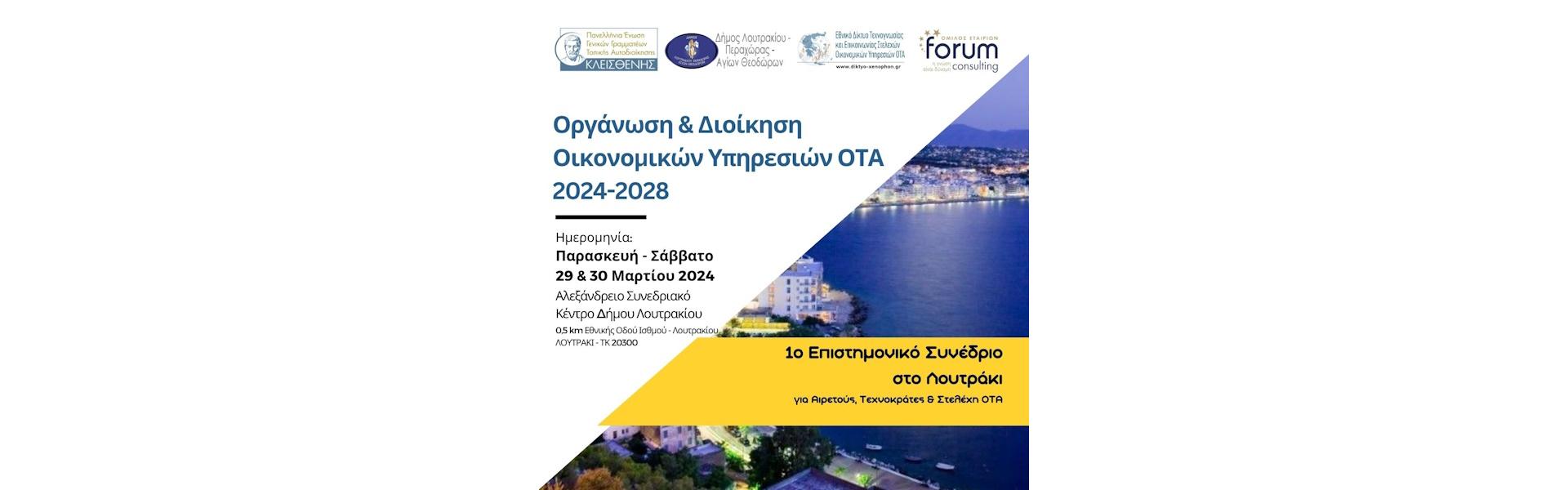 The National Expertise & Communication Network of Executives of Financial Services OTA "XENOFON", in collaboration with the Panhellenic Association of General Secretaries of Local Governments "Kleistheni", the Group of Companies Forum Consulting & the Municipality of Loutraki - Perachora - Agios Theodoros, INVITES the executives of the OTAs, Technocrats & Iretous at the 1st Scientific Conference on the Organization & Administration of Local Government Financial Services 2024-2028.