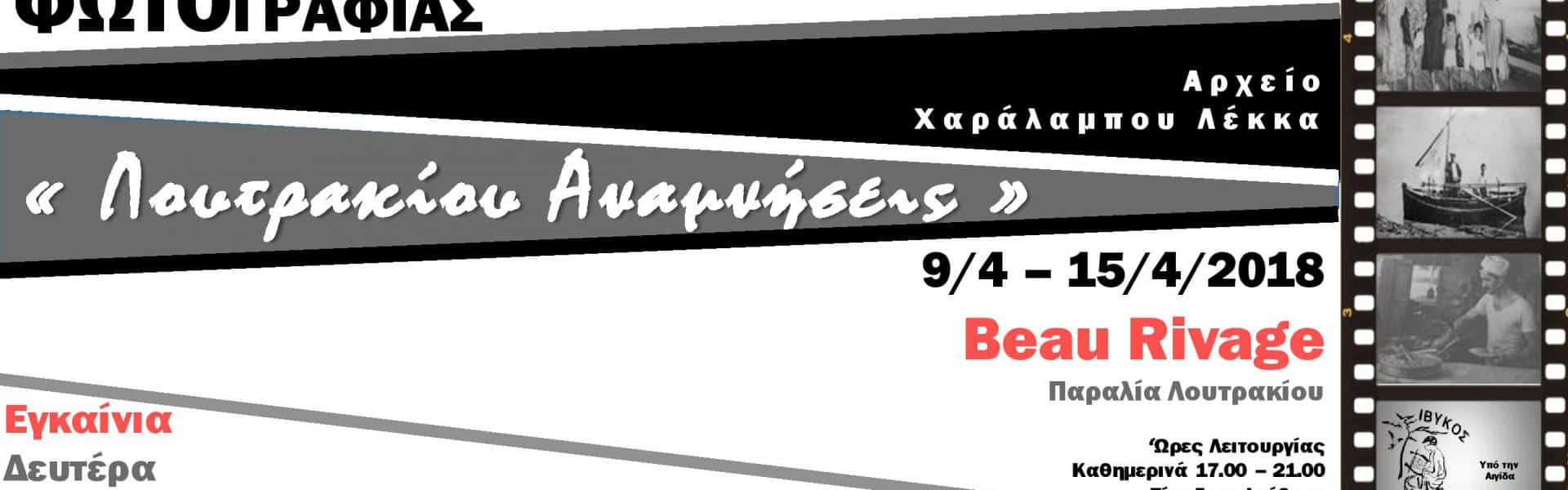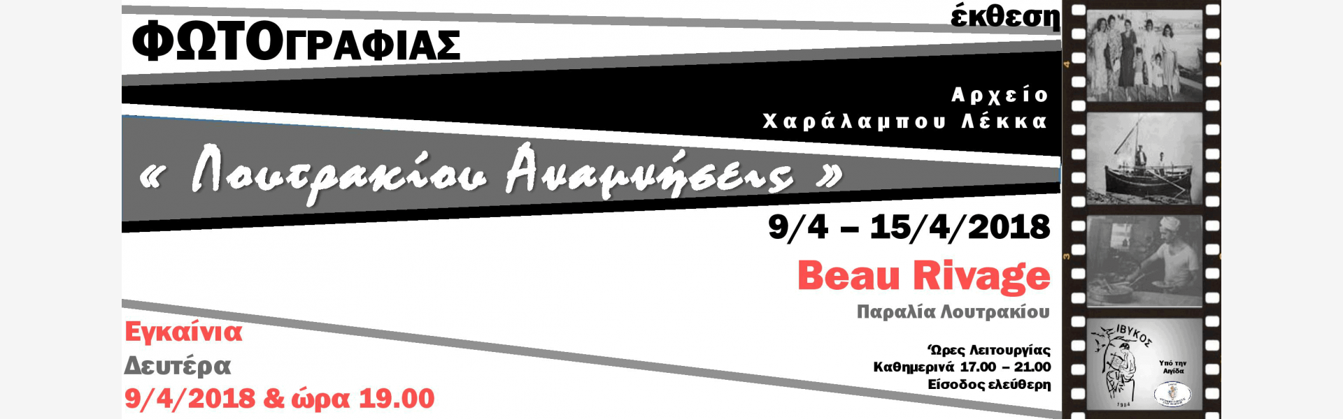 The Association Loutrakioton - Perachroton «IVYKOS», invites you to the grand opening of their photo exhibition, which is entitled «Memories of Loutraki», on Easter Monday 9th April 2018 at 19:00, at the former Beau Rivage hotel on Loutraki beach.