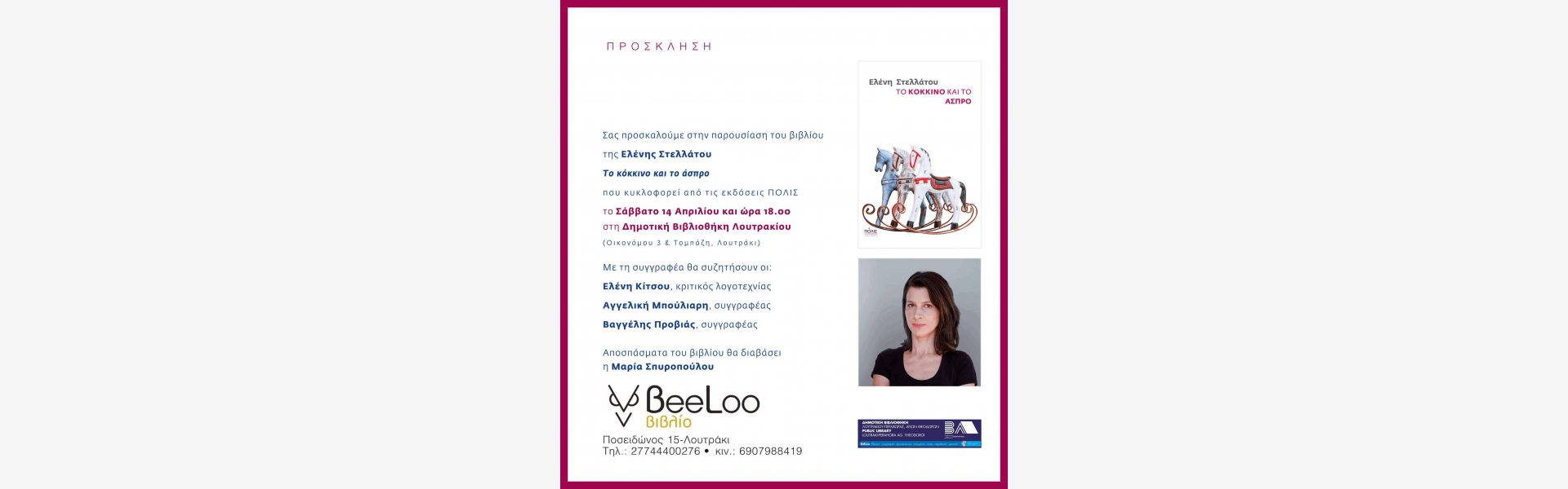 We invite you to Eleni Stellatou's book presentation «The Red and the White», which is published by POLIS publications, on Saturday, April 14 2018,18.00,  at the Municipal Library of Loutraki (3, Economou & Tobazi Str., Loutraki).